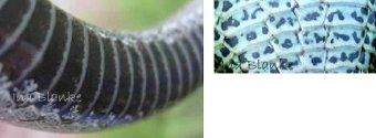 2 Augenlider unbeweglich, da zu durchsichtiger Brille verwachsen (Augen erscheinen vor der Häutung trübe), nur eine Längsreihe von Bauchschildern (s. Abb. unten links)