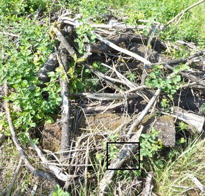 Zauneidechsen sonnen sich besonders gerne auf Holz, starkes Material erwärmt sich besonders gut. Holzhaufen bieten aber auch Rückzugsorte für problematische Pflanzenarten (hier: Spiersträucher - und im markierten Kasten eine Zauneidechse). Es sollte daher fallweise geprüft werden, ob ihre Anlage sinnvoll ist. Fotos: Ina Blanke