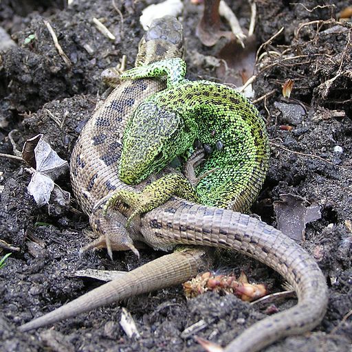 Zauneidechsenpaare sind insbesondere im Mai regelmäßig anzutreffen. Die Spuren der Paarungsbisse sind bei den Weibchen noch längere Zeit als dunkle Flecken zu erkennen.